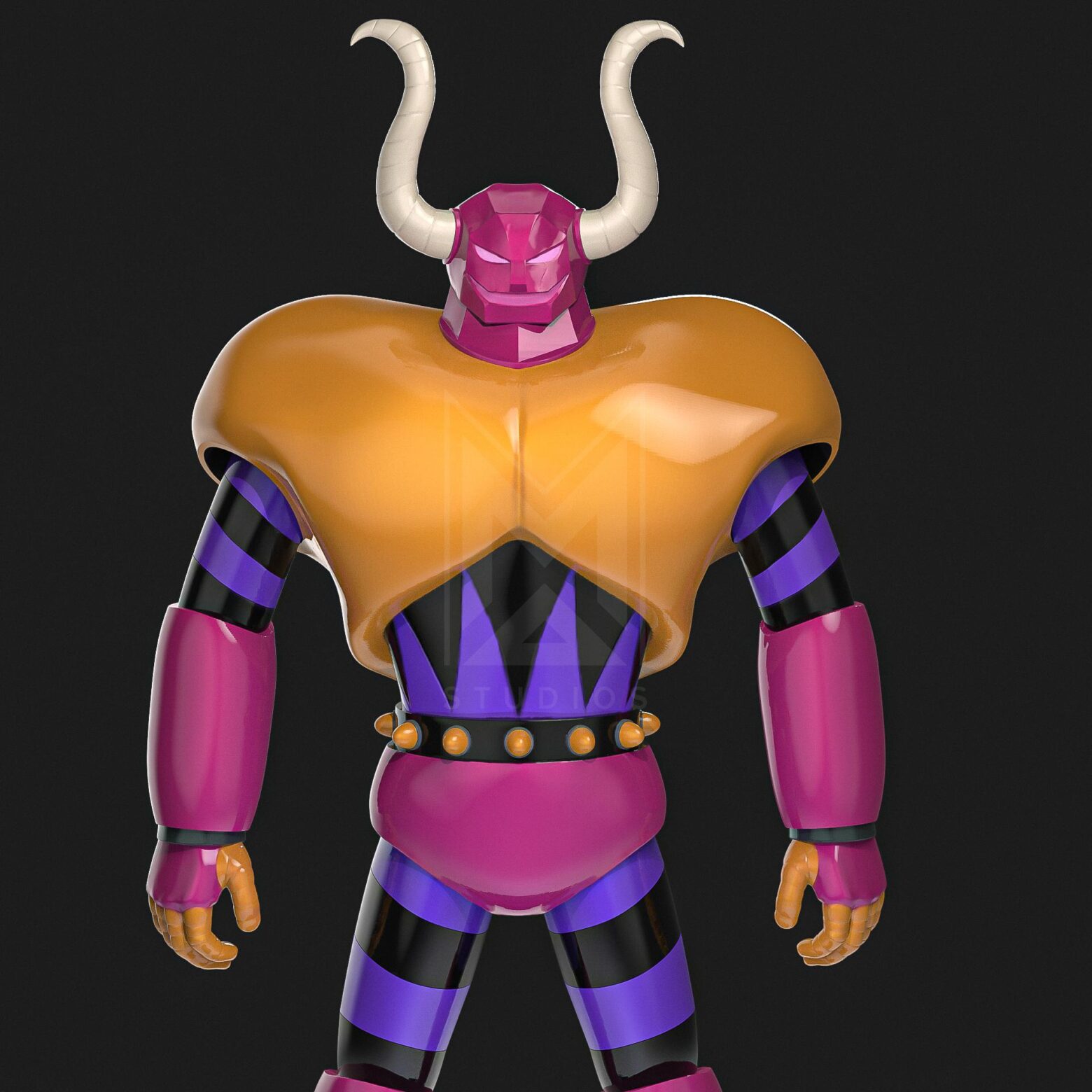 In particular, his face is light red and on each side of his face he has large horns that resemble a bull.