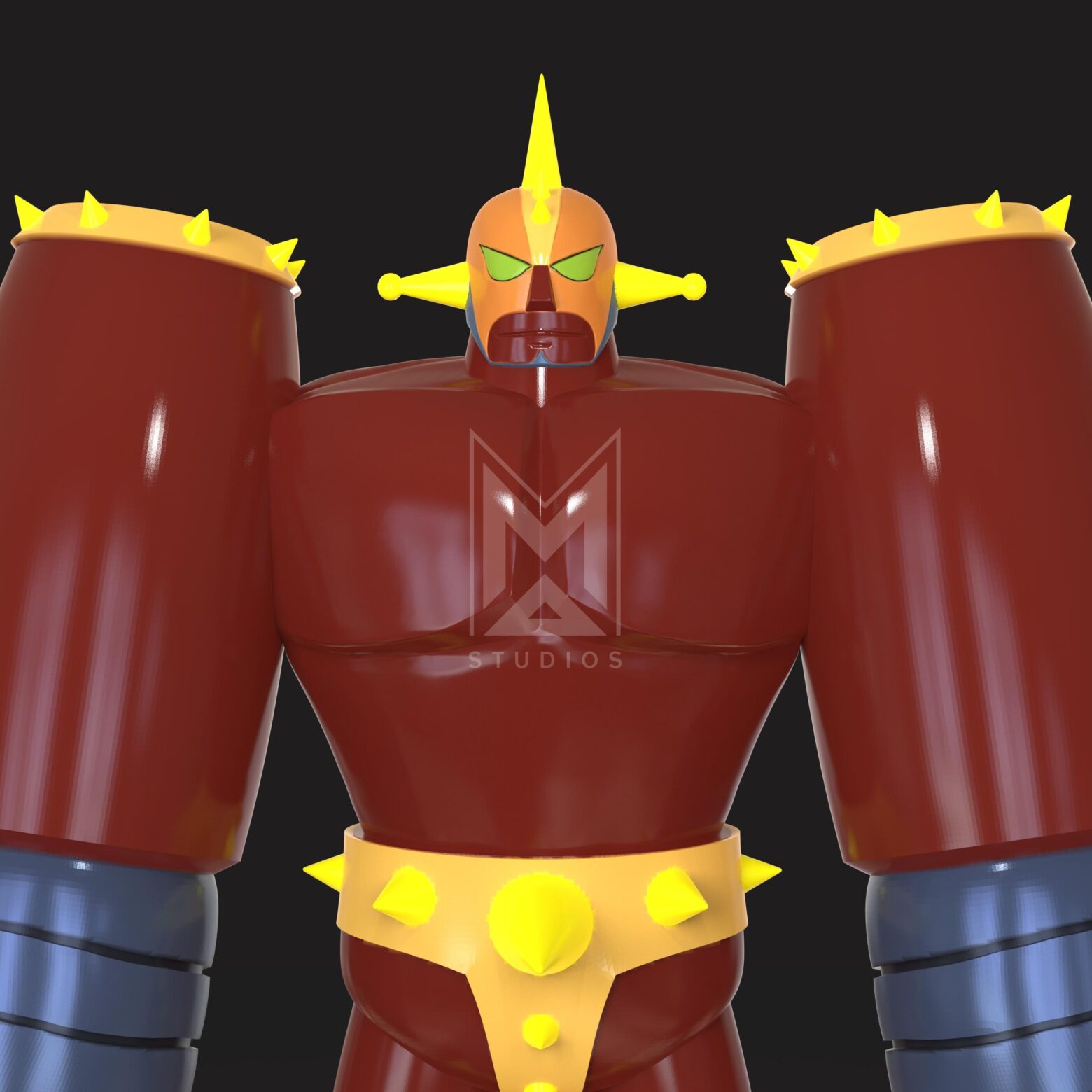 It also possesses several spikes on its belt, knees, and head.