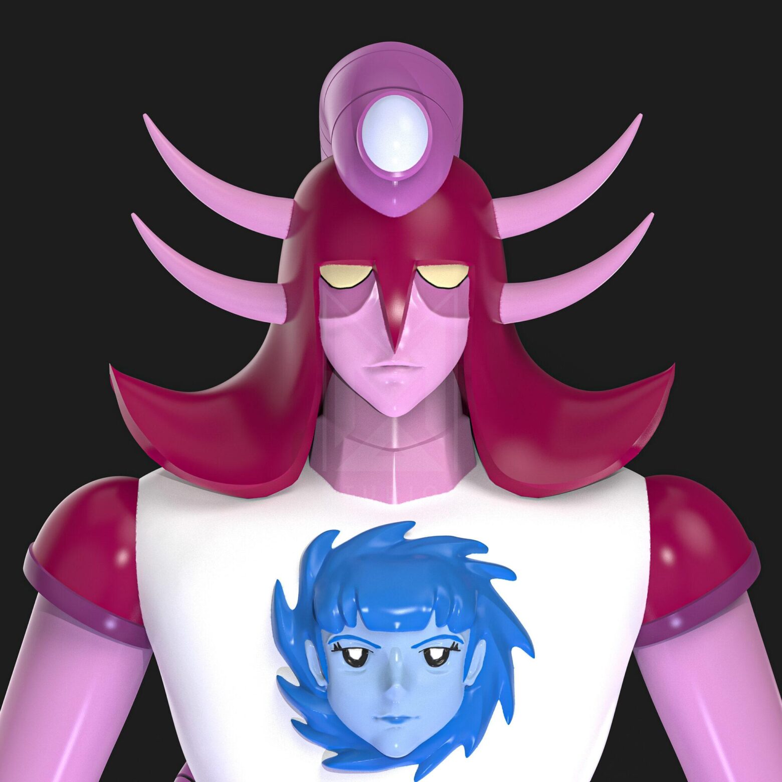 He also has a blue human face on his chest; however, when activated by Lorelai Heinrich, it changes to a flesh-colored face with brown hair.