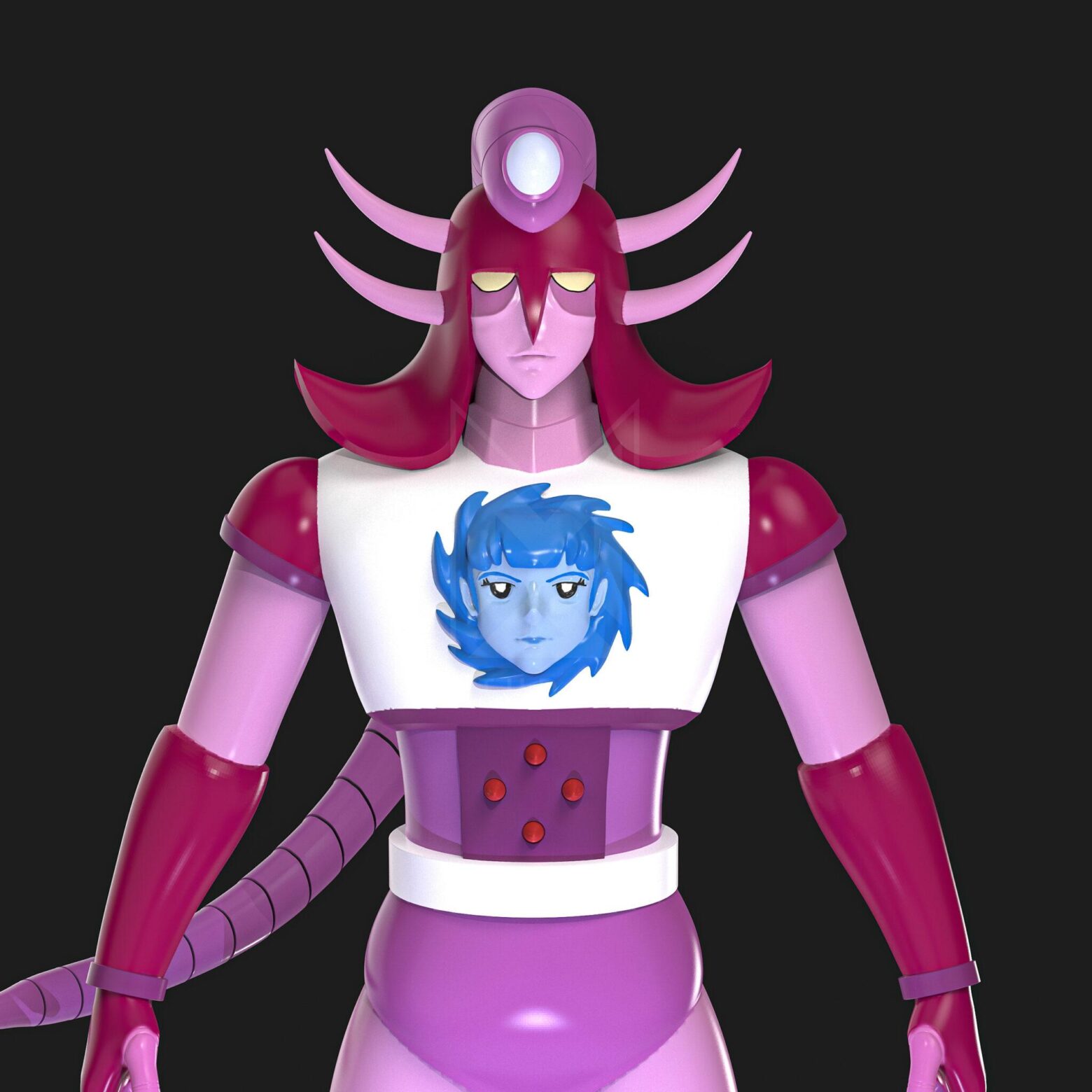 He also has a blue human face on his chest; however, when activated by Lorelai Heinrich, it changes to a flesh-colored face with brown hair.