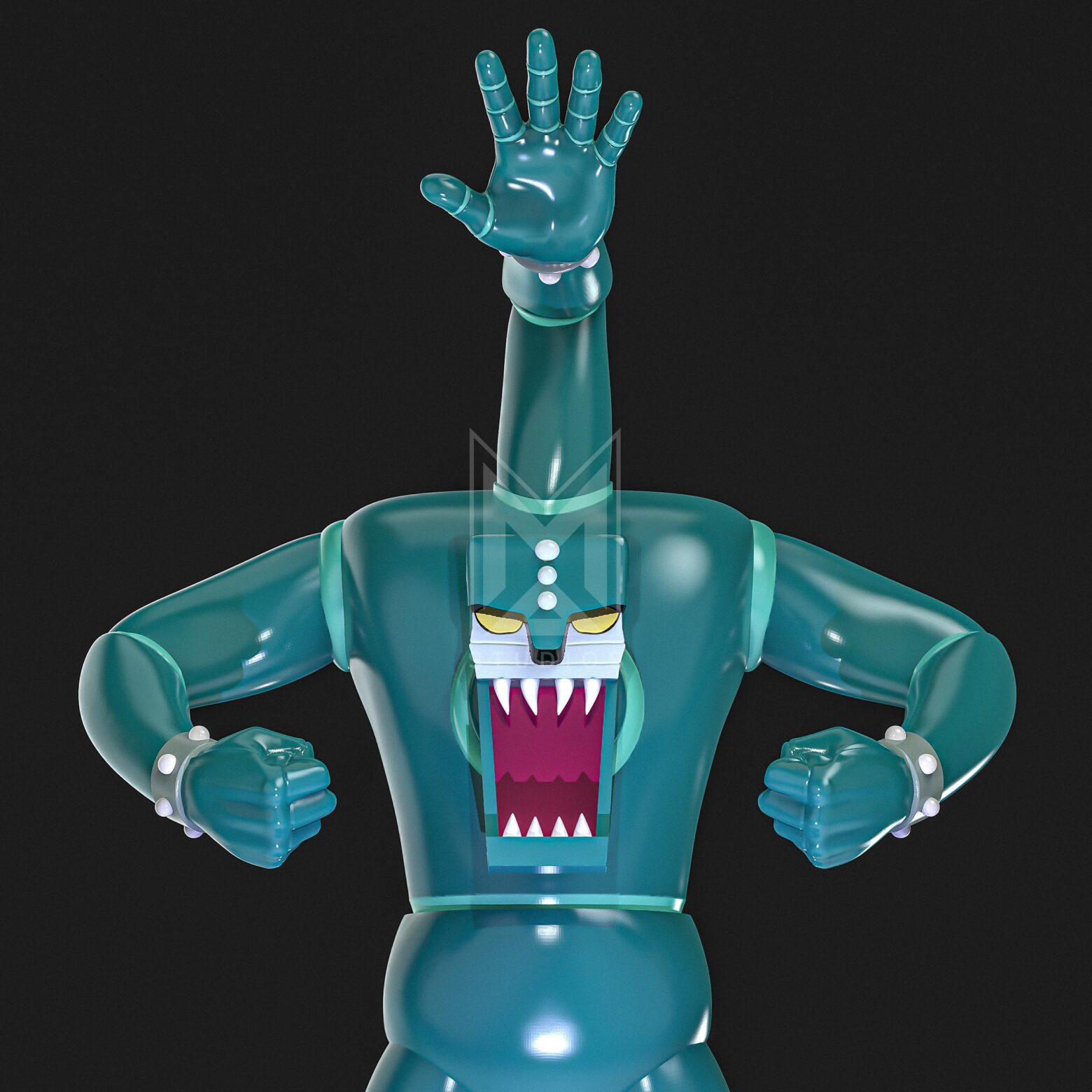 In short, Triple L5 is a humanoid mechanical beast-like character, characterized by having an arm where the head would be, and its head is located in the center of its chest.